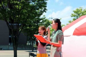 当日は青空市の名に相応しく快晴であつ~い日でした。暑さに負けない熱い心を持って、イベント盛り上げていくぞ にこにこ笑顔でMCスタート! ちなみに出店者さん・出演者さん・お客様の安全を守るのも私たちMCのお仕事の一部、熱中症予防のためのこまめな水分補給を呼びかけます。