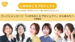 まずはじめに「いのちのこえプロジェクト」に携わってくれたナレーター、アナウンサー、MC、HEARTFULLメンバー、プロを志す皆さん。企画実現に向けて一緒に走ってくれた裏方メンバーのみんなも、たくさんのチーム司会者事務所 Office AYANAメンバーに感謝の想いを込めて、今後も開催場所を検討しながら、全国どこからでもお聴きいただけます。